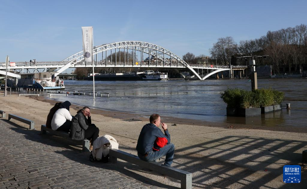 2月25日,在法國巴黎,人們在水位上漲的塞納河畔休閑。